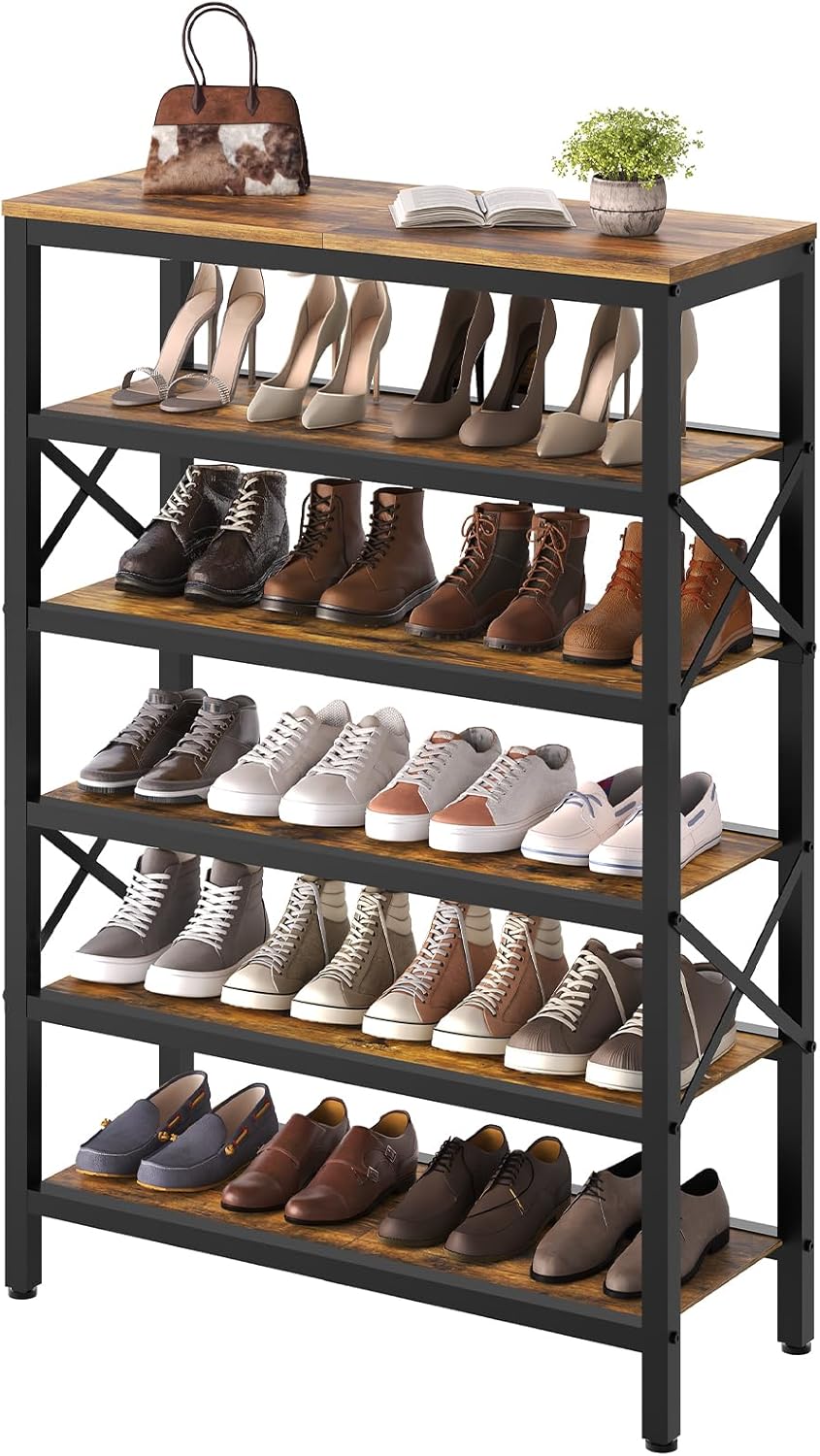 YATINEY 6-Tier Tall Shoe Rack Organizer, Wooden Shoe Storage for Closet Holds 24 Pairs, Sturdy Shoe Shelf with X-Shaped Metal Support, for Entryway, Bedroom, Rustic Brown and Black SS206BR