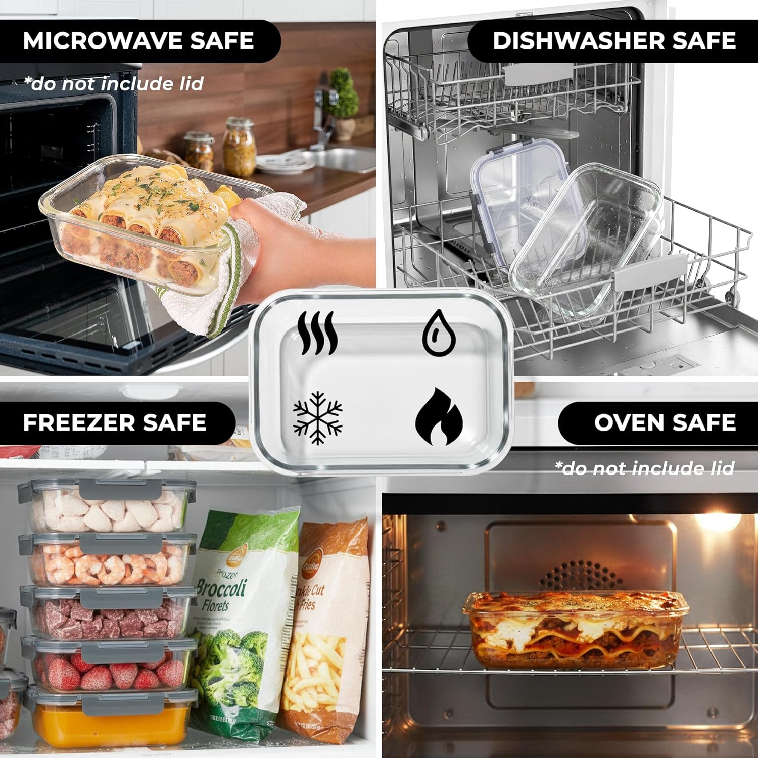 Premium Borosilicate Glass Food Storage Containers: Featuring a 100% BPA free thick glass that can withstand heat up to 600 degrees Fahrenheit making this glass container best for microwave, oven and freezer. Package comes with 5 rectangular container pieces with 36oz capacity that is perfect for packing work lunch portions, storing leftovers, and neatly prepped meal servings. Note: Lids and silicone rings need to be removed when heating food in the microwave or oven.