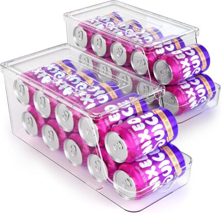Soda Can Dispenser for Refrigerator with Lids, Stackable Drink Organizer for Fridge, Clear Plastic Refrigerator Organizer Bins, Beverage Can Holders for Pantry, Freezer, Kitchen, Cabinets Set of 2
