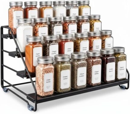 4 Tier Spice Rack Organizer for Cabinet, Step Adjustable Spice Shelf Seasoning Organizer with Non Slip Tiers, Expandable Metal Spice Rack for Kitchen Countertop, Pantry, Cupboard – Black