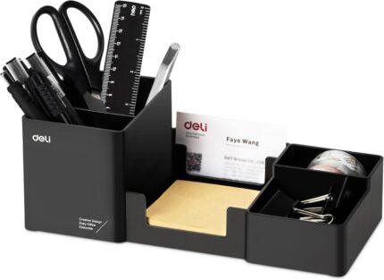 deli Desk Organizer, Plastic Desktop Organizer with Pencil Holder and Sticky Note Tray, Office Stationery Supplies Organizers Accessories Caddy, 6 Compartments, Black
